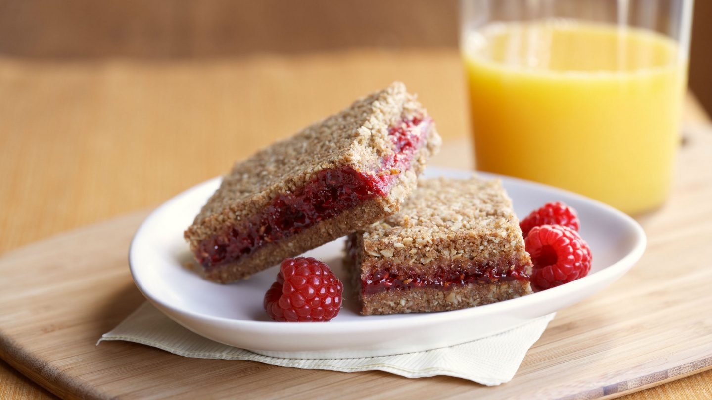Hindbærstænger fulde af fibre, og som er nemme at lave – perfekt som snack eller hurtig morgenmad. Det er vigtigt at presse krummerne godt sammen, sådan at stangen holdes på plads, og får sin form.